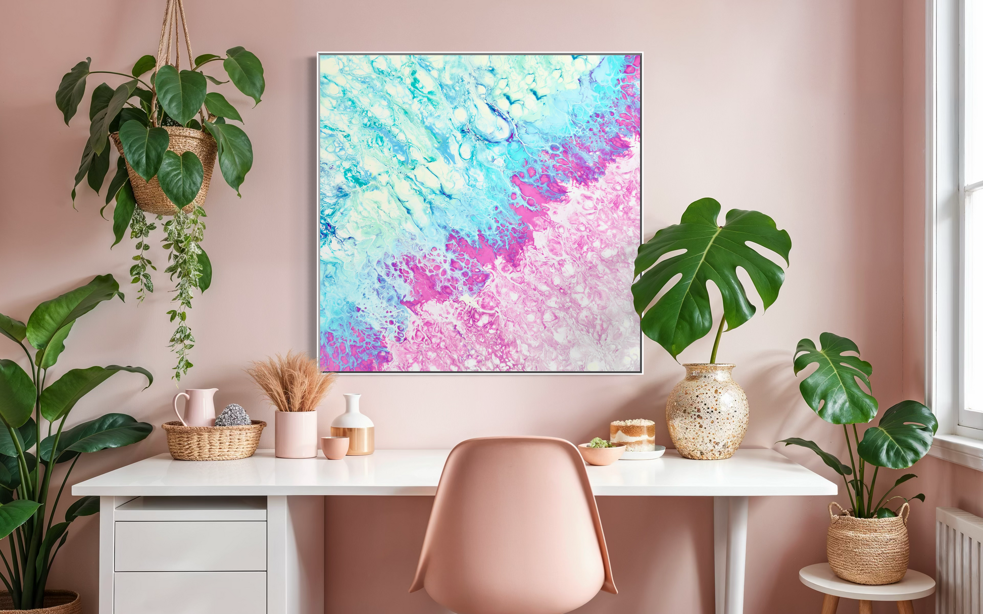 Chromatic Drift (canvas print) - A quiet unravelling - where colour becomes current and emotion moves in gradients. Turquoise, blush and cerulean swirl in marbled suspension, echoing the rhythm of thought as it softens and slips beyond language. This work invites stillness, yet never quite stands still; its drifts. A meditation in hue and hush, a moment of chromatic surrender - where fluid is feeling and beauty is breath.