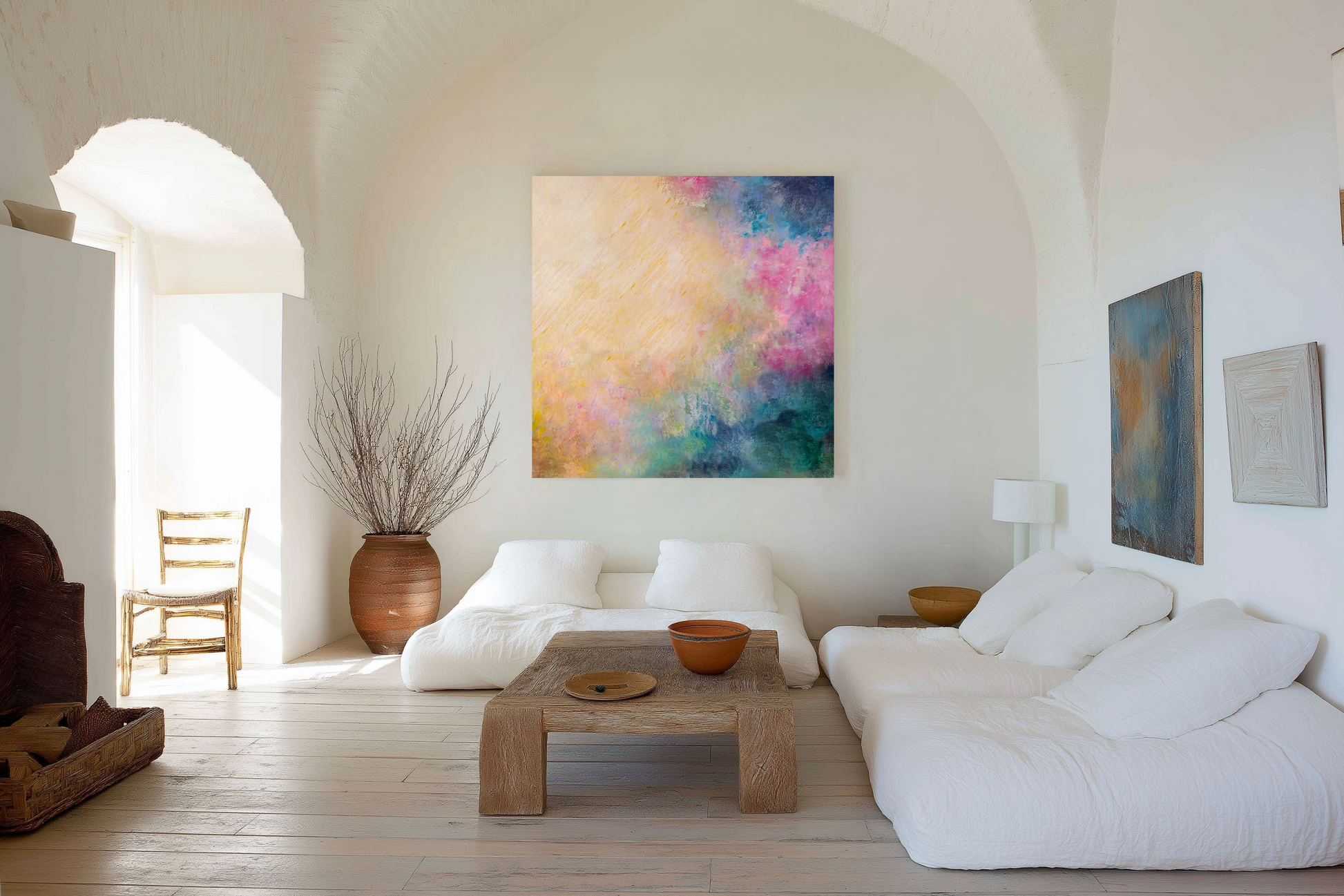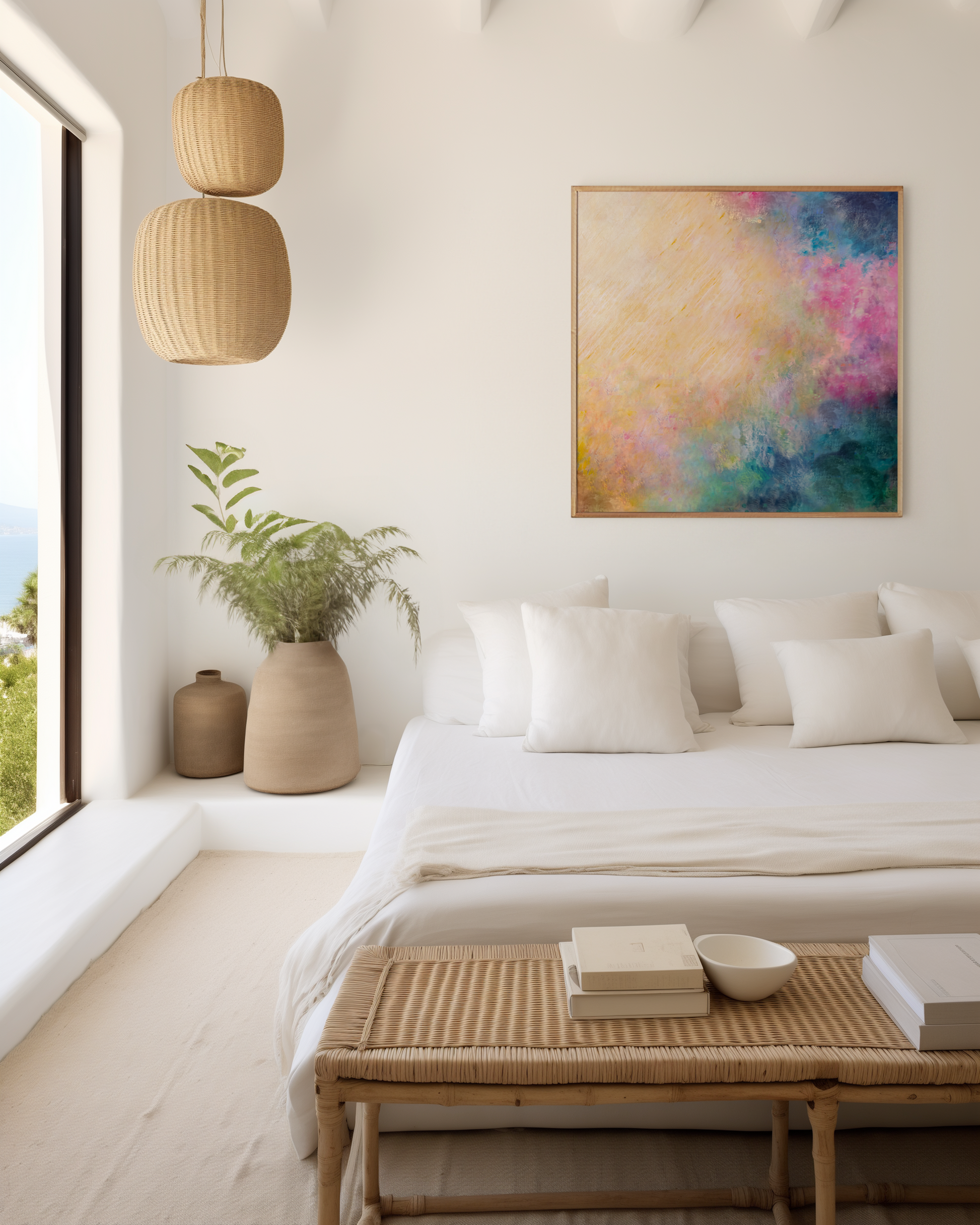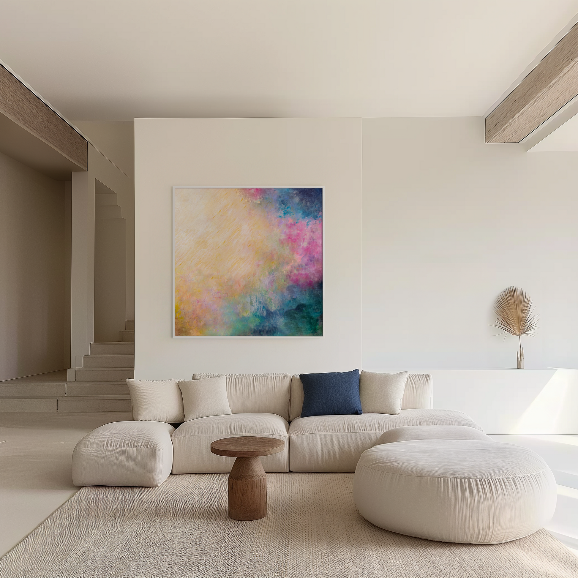 This colourful modern abstract art print brings a sense of serenity and effortless brightness to any room — perfect for contemporary homes, coastal interiors or spaces that need a touch of warmth and joy. The subtle energy and movement in the brushwork invite you to pause, breathe, and feel the softness of long, hazy summer afternoons.