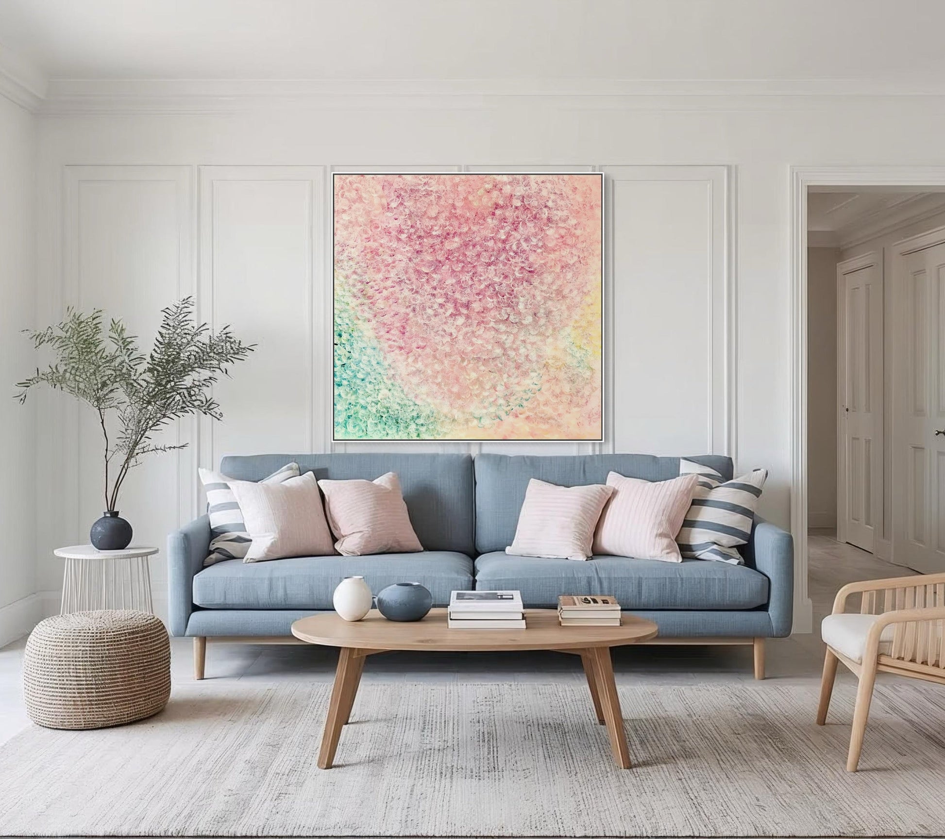 Delicate pinks bloom across the canvas, kissed with hints of aqua and gold—a palette that feels like hope itself. The subtle texture and ethereal quality create a sense of something precious emerging, something tender and new.