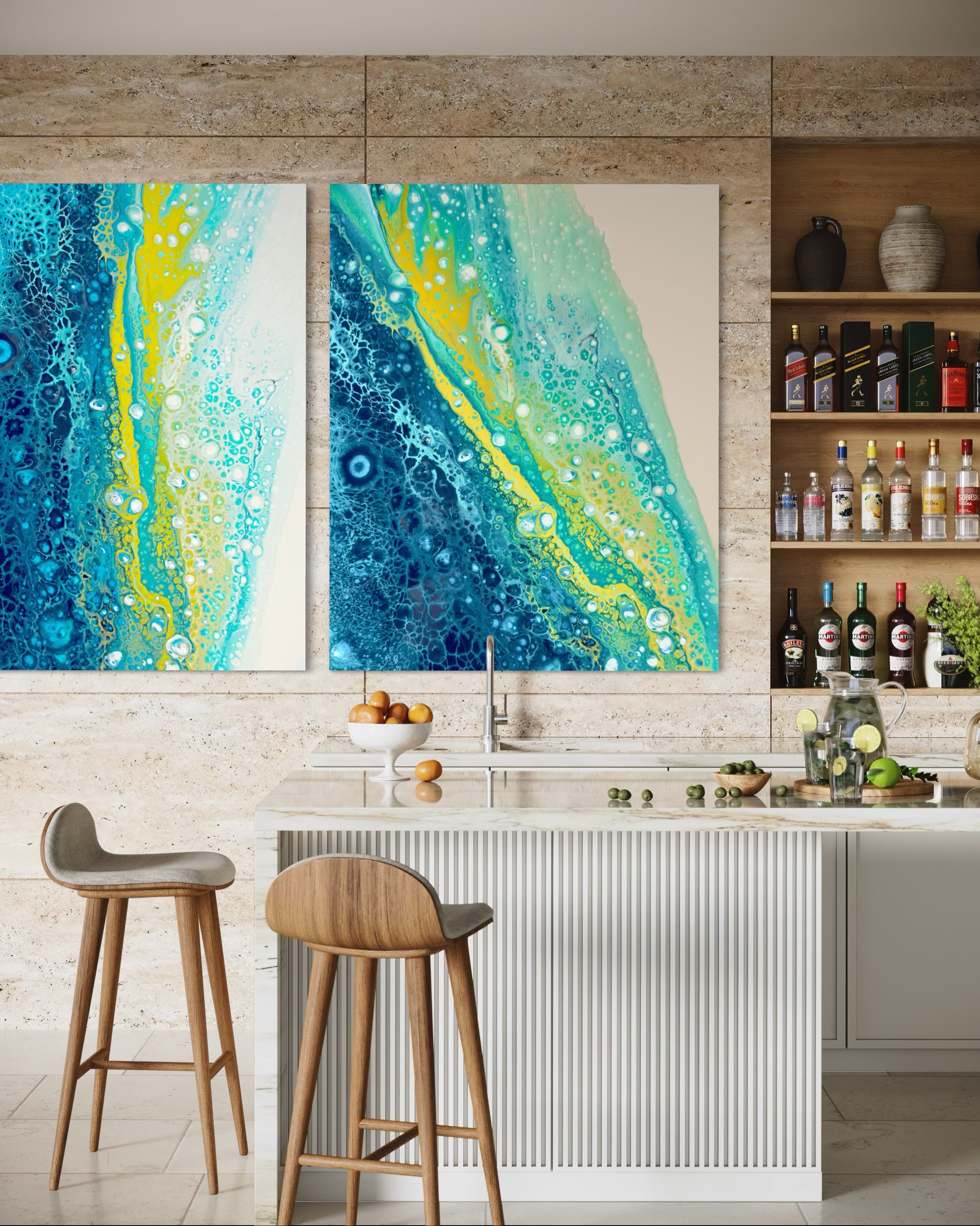 RISING CURRENT & TIDAL LIGHT - Gallery Set of Two Prints (canvas print) - This two-piece gallery set — Rising Current and Tidal Light — captures the soft meeting point of sea and sky. Layered hues of deep indigo, turquoise, and gentle gold flow together in a tranquil rhythm that brings balance and quiet energy to any space.
