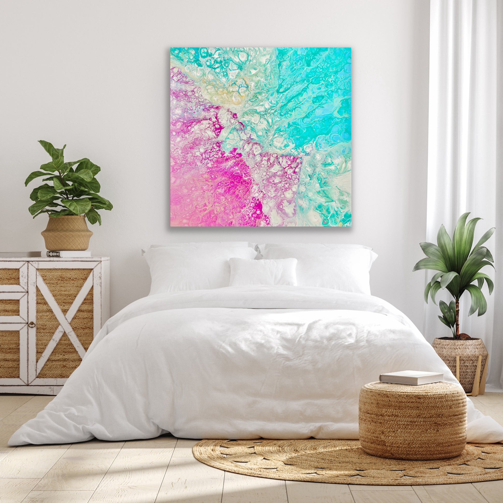 Whispers in Water (canvas print) - A meditation in motion - where colour flows like memory and silence speaks in shimmer.  Turquoise and blush ripple across the canvas like thoughts drifting beneath the surface, softened by the hush of beige and the breath of teal.  This piece evokes the gentle pull of introspection.  A visual exhale, inviting the viewer to pause, listen and be carried inward by the tide of feeling.