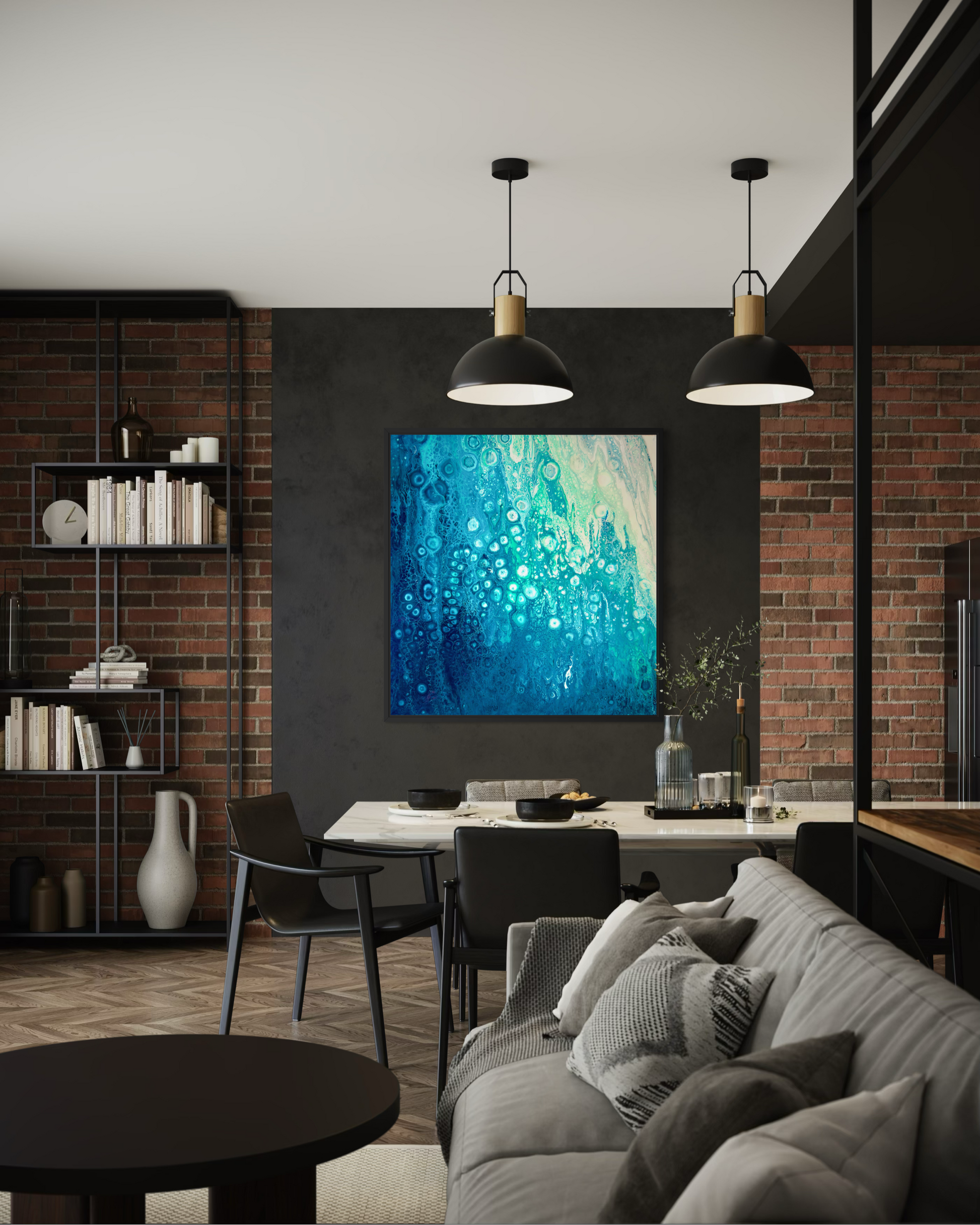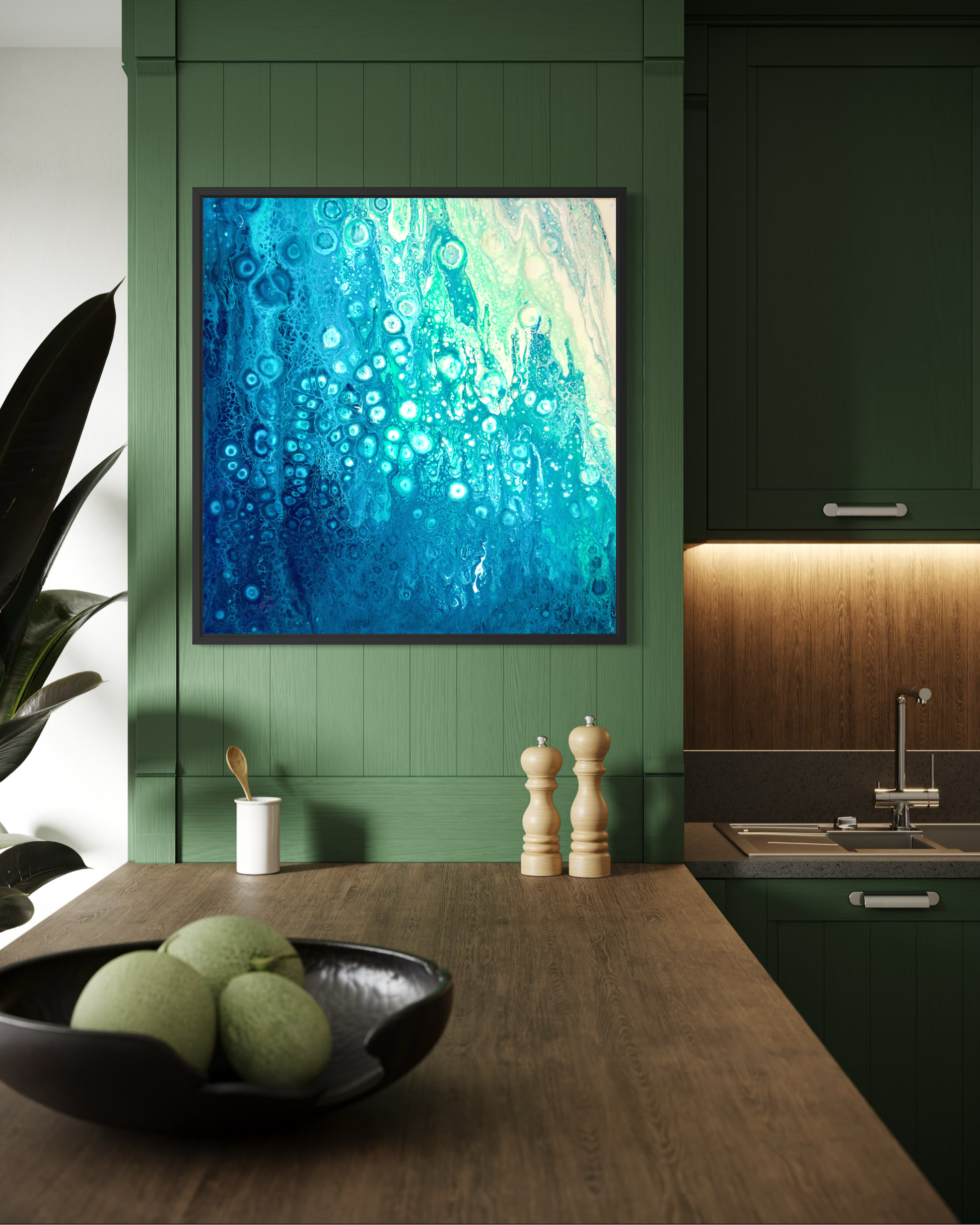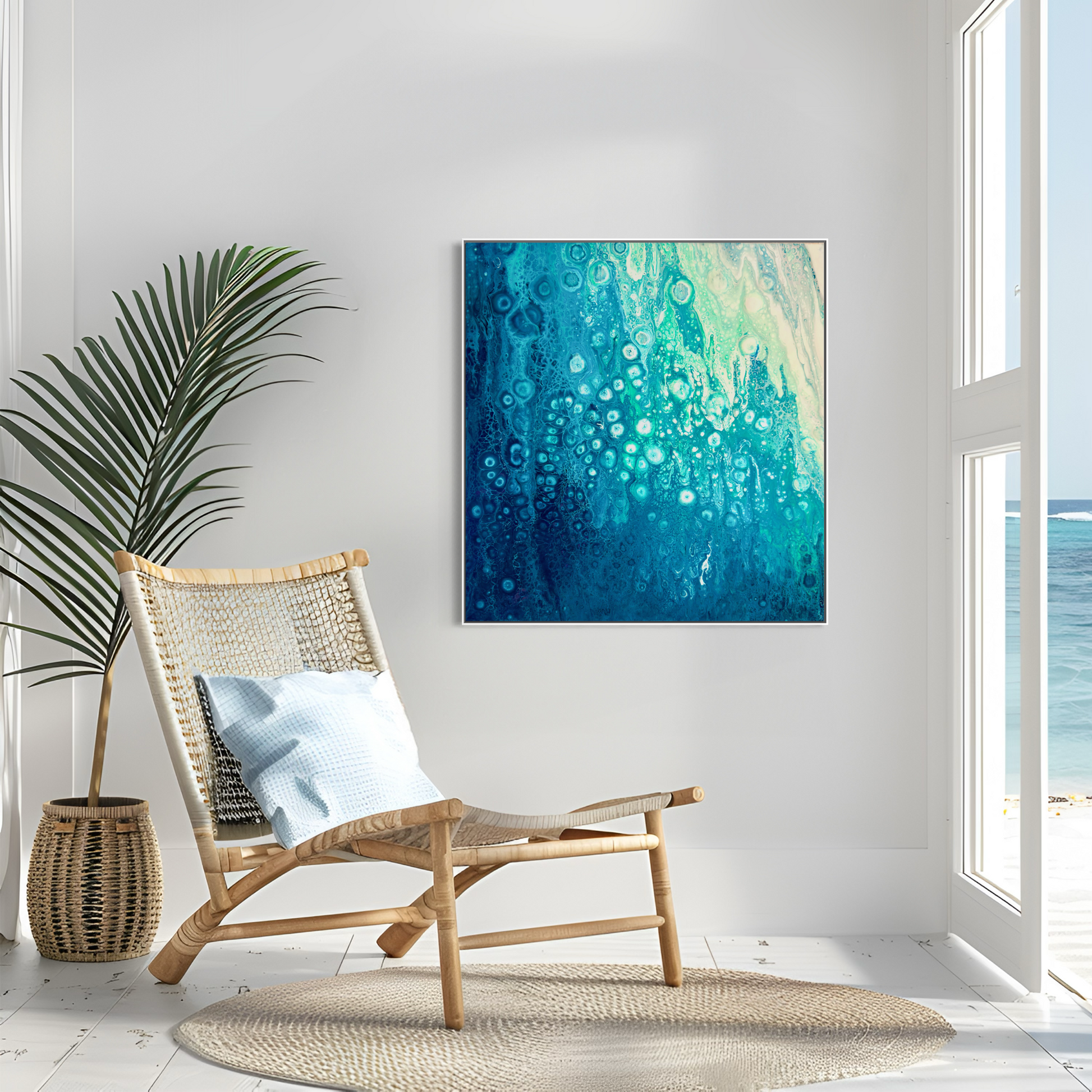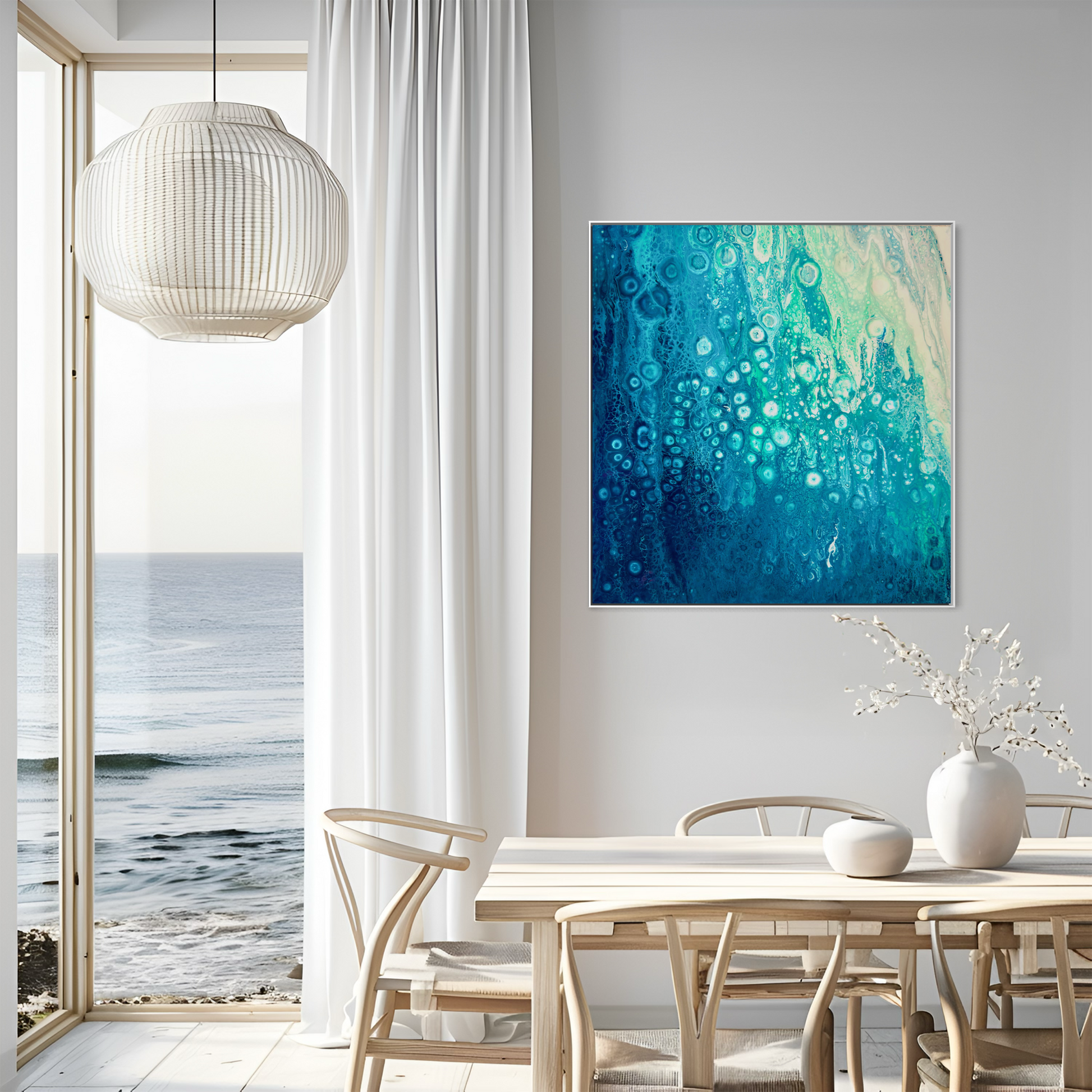 Whispers of the Deep (canvas print) - is a contemplative exploration of the ocean's hidden language. Fluid layers of turquoise, teak and aqua rippling across the canvas. The organic, cellular textures suggest coral, currents and unseen depths - reminders of natures complexity and mystery.